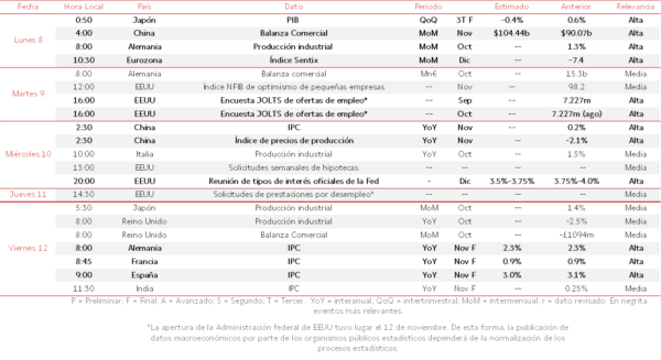 Entre las referencias macroeconómicas protagonistas de la próxima semana en la región Asia-Pacífico será clave la evolución de la balanza comercial de China durante noviembre, tras la caída interanual de las ventas al exterior el mes anterior. Paralelamente, destacará el dato de la tasa de inflación general en noviembre (vs. 0,2% interanual en octubre) y el índice de precios de producción (vs. -2,1% interanual) en un entorno de gran competitividad empresarial, consecuencia de la debilidad de la demanda interna y de la sobrecapacidad de producción. Por su parte, en Japón serán relevante el PIB del 3T de 2025 (0,6% trimestral en el 2T) y la evolución de la producción industrial de octubre. Por último, en India el foco de atención se situará en la lectura final de la tasa de variación interanual del IPC general en noviembre.