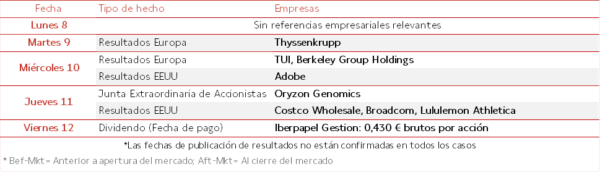 En el ámbito empresarial, destacará la publicación de resultados de Thyssenkrupp, TUI y Berkeley Group Holdings, entre otros. A su vez, será relevante el pago de dividendos de Iberpapel Gestion y la junta extraordinaria de accionistas de Oryzon Genomics.