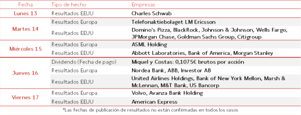 En el ámbito empresarial, destacará la publicación de resultados de ASML Holding, Nordea Bank, ABB, y Volvo, entre otros. Además, será relevante el pago de dividendos de Miquel y Costas, entre otros.