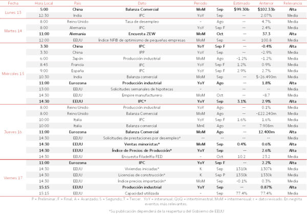 Respecto a las referencias macroeconómicas de instituciones privadas y otros organismos, el martes 14 se publicará el índice NFIB de optimismo de las pequeñas empresas de septiembre, que representan el 50% del tejido empresarial estadounidense. El jueves 16, se conocerá la encuesta de la Fed de Filadelfia de octubre (vs. 23,2 puntos en septiembre). Para terminar la semana la atención se centrará en el dato de la Fed de la variación de la producción industrial en septiembre (vs. 0,87% interanual en agosto).