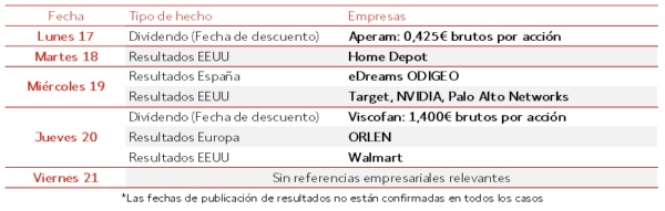 En el ámbito empresarial, será relevante la presentación de resultados de Home Depot, Target, NVIDIA, Palo Alto Networks y Walmart, entre otros.