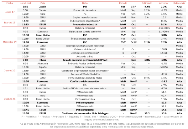 Al día siguiente, la atención se centrará en el dato preliminar de la confianza del consumidor de noviembre en la Eurozona (vs. -14,2 puntos en octubre). Paralelamente, se publicará el índice de precios de producción de octubre en Alemania (vs.-1,7% interanual en septiembre) y la balanza comercial de septiembre de España (vs. -5.983 millones de € en agosto). Para terminar la semana en Reino Unido se publicará el índice GfK de confianza del consumidor de noviembre (-17,0 puntos en octubre) y las ventas minoristas de octubre (vs. 1,5% interanual en septiembre). Paralelamente, la atención se situará en las lecturas preliminares de los indicadores adelantados PMIs compuestos de la Eurozona y de Reino Unido del mes de noviembre (vs. 52,5 y 52,2 puntos en octubre).