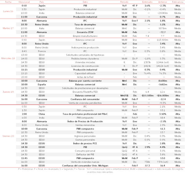 El martes 17 se publicará el índice manufacturero Empire State de febrero, tras repuntar notablemente a 7,7 puntos en enero. Al día siguiente, el miércoles 18, la atención se centrará en la evolución de la producción industrial estadounidense en enero (vs. 0,4% mensual en diciembre) y en los pedidos de bienes duraderos de diciembre (vs. 5,3% en noviembre). Paralelamente, se publicarán las solicitudes semanales de hipotecas, el número de viviendas iniciadas y las licencias de construcción concedidas en diciembre, así como las actas de la Fed de la última reunión de política monetaria del pasado 28 de enero. Por su parte, el jueves 20, será relevante el saldo de la balanza comercial de diciembre (vs. -56.800 millones de $ noviembre) y las solicitudes semanales de prestaciones por desempleo.