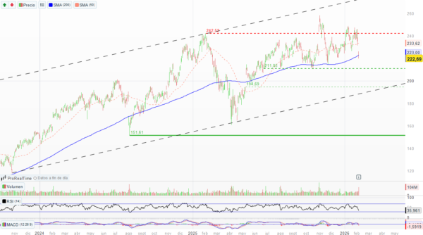 Amazon cotiza en tendencia alcista de largo plazo. Aunque llegó a superar los 242,52, no lo hizo con claridad y no pudo romper la zona de resistencia, volviendo a retroceder. Recientemente ha caído por debajo de la media de 200 sesiones y la tendencia de corto plazo es bajista. De perder la zona de 211, podría encontrar soporte en el cierre del hueco en 195.