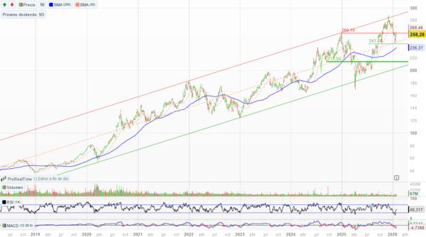 Apple cotiza dentro de un canal alcista de largo plazo, cuyo techo y suelo actúan como resistencia y soporte respectivamente. A corto y medio plazo, los niveles de soporte y resistencia dentro del canal están definidos por los retrocesos de Fibonacci, con un resistencia de corto plazo en la zona de 260 y soportes en las zonas de 243 y 214,50.