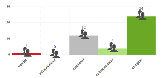 Según el consenso de analistas que recoge FactSet, el precio objetivo promedio se situaba en 876,68 € antes del reporte trimestral, lo que supondría que prácticamente ha agotado el potencial de revalorización, si bien ya se han empezado a ver revisiones al alza. Las opiniones de los analistas que publica FactSet se distribuyen de la siguiente forma: