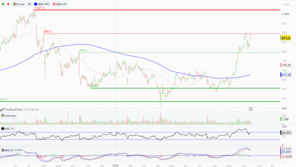 A corto plazo, consolida entre las zonas de 800 – 900 €, tras el rally que se anotó en septiembre, con una revalorización superior al 40%. Una eventual superación de la zona de 900 € sería una señal alcista con un primer objetivo en los máximos de 1.021 € y la potencial reanudación de la tendencia alcista de largo plazo.