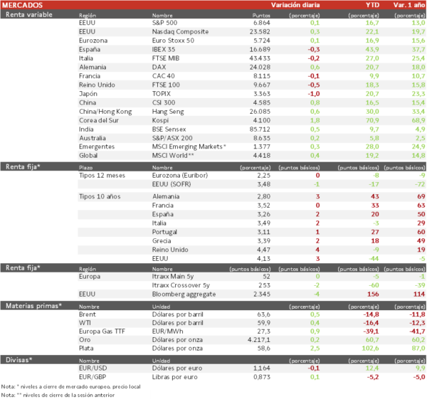 - En la región Asia-Pacífico, el Hang Seng hongkonés ha registrado la mayor revalorización (0,6%), mientras que el Topix japonés ha retrocedido un 1,1%. El representante de Comercio de EEUU, Jamieson Greer, ha comentado que el comercio de EEUU con China debe equilibrarse y probablemente debe ser menor, y considera que una caída del 25% en el comercio de bienes con China iría en la dirección correcta. En el plano empresarial, Moore Threads Technology, un fabricante chino líder de chips de inteligencia artificial, se disparó hasta un 500% en su debut en Shanghái tras recaudar 1.130 millones de dólares en la OPI.