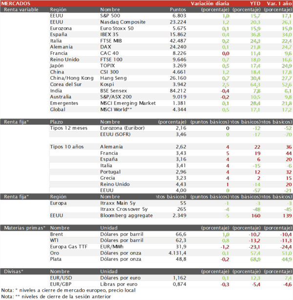 - En Asia, la jornada fue positiva con subidas en las bolsas de Corea del Sur del 2,5% y de Japón del 0,48%. Sin embargo, los indices de Hong Kong (Hang Seng) y de China (CSI 300) han subido ligeramente un 0,7% y un 1,2% respectivamente.
