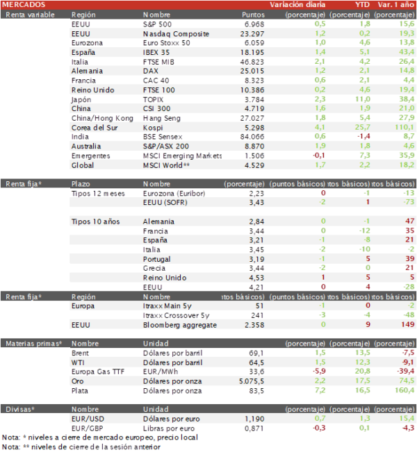 - En España, la jornada ha estado liderada por el Banco Sabadell, con un aumento notable (+5,5%), seguido de Solaria (+3,4%) y de Indra (+3,3%). El sector bancario ha cerrado la sesión con subidas generalizadas, recuperando parte de las pérdidas que sufrió la semana anterior. Los pocos descensos de la sesión se concentraron en el sector de Utilities.