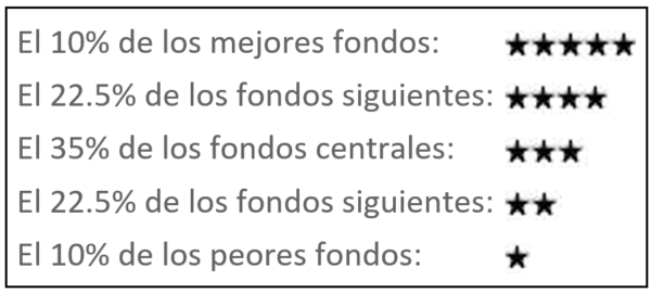 Para lo primero, podemos fijarnos en el rating. Hay varios tipos de rating, pero uno de ellos es el que se utiliza para evaluar el comportamiento de un fondo en relación con otros de su categoría. Suele ser fundamentalmente cuantitativo, y no refleja ninguna especulación sobre el comportamiento o potencial en el futuro. Este rating se otorga por ciertas compañías independientes (Morningstar, Lipper…), especializadas en el análisis de productos. Uno de los más son las estrellas Morningstar, que evalúan un fondo frente a los demás fondos de su categoría, de forma cuantitativa, en función de la rentabilidad y del riesgo pasados. En función de este criterio, Morningstar atribuye un determinado número de estrellas a cada fondo.
