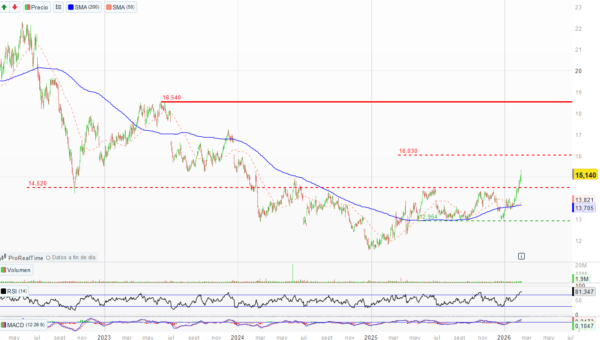 Técnicamente su situación ha ido mejorando gradualmente desde comienzo de 2025, y la reciente superación de la zona de 14,50 es una señal importante de una incipiente estructura alcista. El objetivo inicial sería la zona de 16,00 (proyección teórica del rango lateral de los últimos meses), con posibles objetivos a medio plazo en 18,54 y superiores. La zona de 14,50 debería ejercer de soporte de corto plazo.