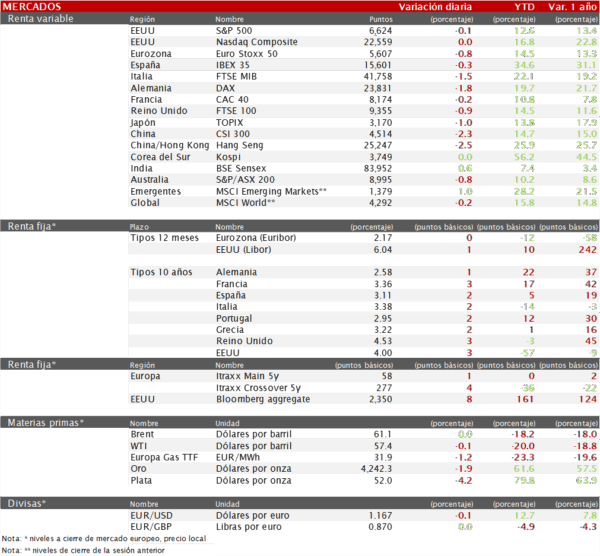 - Hoy ha destacado el DAX alemán con una caída de un 1,8% liderada por sus valores financieros con importante exposición a EEUU y por tomas de beneficios en el sector industrial. El IBEX 35 ha perdido tan solo un 0,3% gracias a la subida del 7% del BBVA tras el fracaso de la OPA y al buen tono de las compañías de infraestructuras.