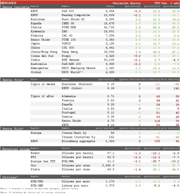• En EEUU se registraban escasas variaciones con los índices consolidando en los últimos días cerca de sus máximos históricos.   Destacan las tomas de beneficios en algunos de los grandes valores tecnológicos como Meta y Alphabet, mientras Salud es hoy el sector más destacado. Al cierre de la sesión europea el S&P 500 cede un 0,3% y el Nasdaq Composite un 0,1%.