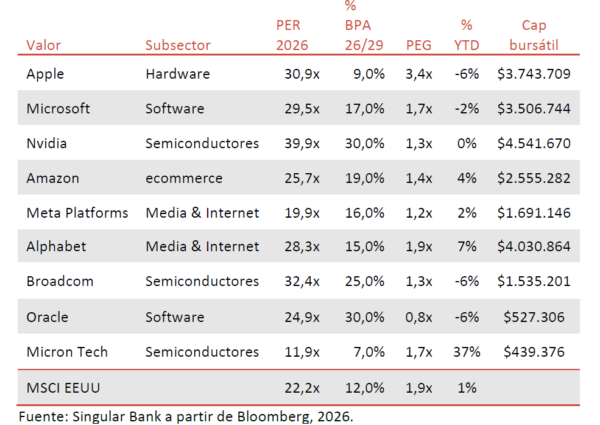 Esta semana empiezan a publicar resultados del 4T las grandes tecnológicas estadounidenses con expectativas de sólidos crecimientos. Sus valoraciones actuales se justifican en base al crecimiento esperado en los próximos años. Así, en términos del Price/Earnings Growth Ratio (PEG), tan sólo Apple (no estrictamente IA) y Alphabet, tras el rally de las últimas semanas, presentan una valoración más elevada que la media del mercado estadounidense.