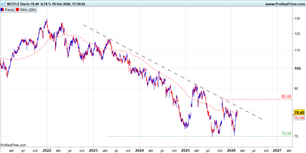 La gran tendencia bajista de Nestlé desde 2022 se ha estabilizado en la zona de 70 CHF. De momento ha formado un rango de consolidación lateral que podría formar parte de un proceso de formación de un suelo importante. La superación de la zona de 85 CHF confirmaría a su vez la ruptura de la directriz bajista y la media de 200 sesiones, confirmando el inicio de una nueva tendencia alcista de medio-largo plazo.