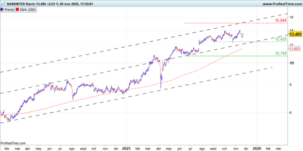 Los bancos son un sector de Beta alta que normalmente caen más que la media del mercado durante las correcciones. Sin embargo, en el actual episodio de volatilidad se están mostrando resilientes. Bankinter se mantiene en una fase de consolidación lateral desde el verano que le está acercando a la base del canal alcista y la media de 200 sesiones en la zona de 12,40 aproximadamente. Esperamos que esa zona sirva de base para un nuevo tramo alcista en las próximas semanas por lo que aprovecharíamos algún retroceso para iniciar una entrada en el valor. El posible objetivo estaría por encima de 15€.