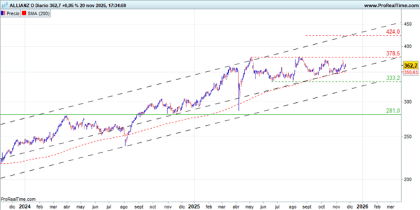 Dentro del sector financiero el sector asegurador puede considerarse una alternativa algo más defensiva a los bancos en un contexto como el actual. Allianz se mantiene en fase de consolidación dentro de su tendencia alcista desde hace algunos meses. En los últimos días se ha apoyado en la base de un posible canal alcista y la media de 200 sesiones, por lo que podría estar cerca de un nuevo tramo alcista significativo. La confirmación sería la superación de la zona de 378€, aunque podría anticiparse una primera entrada en los niveles actuales y añadir en la eventual ruptura alcista. El objetivo teórico estaría en torno a 425€.